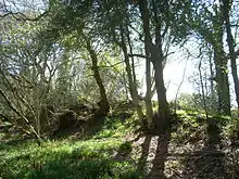 The outlier extends across fields but is more clearly marked towards the north end within Crates Wood where it reaches a maximum height of 2.8 metres (9.2 ft), with a 0.4-metre (1.3 ft) deep ditch on its west side. The bank is up to 6 metres (20 ft) wide and the ditch measures 3 to 5 metres (9.8 to 16.4 ft) wide. On its east side the earthwork's scarp stands 1.8 metres (5.9 ft) high and forms a field boundary. At the south end where it crosses fields the bank is much reduced by ploughing, with a maximum height of 0.6 metres (2.0 ft) and traces of a ploughed-out ditch.[5]
