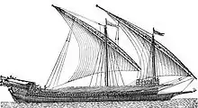 Towards the 16th century there is news of a single deck tartane with three small masts in Provence (France).[30] Regarding its military use, one of the first mentions of the tartane in the 17th century is found in the 1614 book, Pantero-Pantera "el Armata Navale", where there is an explanation of the maneuvers of the tartanes of the French navy.[31]