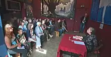 From its inception in 1988, the Centre de l'Imaginaire Arthurien has led in multiple areas. Its eclectic exhibitions include modern works as well as Preraphaelite paintings. It organises (and hosts) spectacles, storytelling,[7] concerts, conferences, guided tours in the forest and educational presentations for school groups. The centre participates in drafting catalogues, educational projects, journées du patrimoine (heritage days)[8] and outreach in schools and universities, assists in documentary research, and compiles bibliographies and iconographies. There are many scholars from different countries among its members.[9]