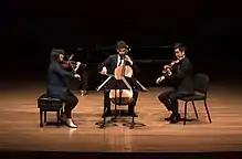 (Left to Right) Chamber Music Society artists Yura Lee, Nicholas Canellakis, and Richard O'Neill