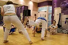 The double mule kick is a dangerous attack movement that can be used when escaping under armada, queixada, or meia-lua-de-compasso.[3] To perform the double mule kick, the capoeirista should evade the attack and get near the attacker by doing a "half" rolê. Then, the capoeirista should forcefully kick the attacker under the chin with both feet.[10]