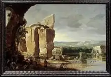 His Utrecht period is characterized by Italianate landscapes and grotto paintings. The seventeenth century Dutch Italianate grotto painting that is characteristic of De Hooch's Utrecht period owes its inception to Cornelis van Poelenbergh of Utrecht. Poelenbergh traveled to the south and, upon his return to Utrecht in the mid-1620s, he continued to depict Italianate landscapes featuring ruins and grottos. De Hooch was most likely involved in initiating this subject matter as an independent genre, along with other followers of Poelenbergh.[13] De Hooch's Italianate landscapes can be clearly associated with those of Poelenburgh and Breenbergh, however it is not known whether he learned about Italianate motifs on a trip south or from Poelenburgh and Breenbergh after they returned to Holland from their own trips to south.[14] De Hooch is known for his intriguing paintings of dramatically lit and spooky grottos which feature classical sculpture and architectural fragments.[14] In his painting Italian landscape with ruins and duck hunters, which is estimated to be completed sometime between 1630 and 1635, a clear connection to the work of Poelenburgh and Breenbergh can be seen. The simple design of the piece and the "solid, monumental composition is accompanied by firmer, more tangible modeling details".[15]