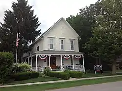 The house is a two-story, wood-framed structure sheathed with clapboard. The massing and steeply pitched roof reflect a Vernacular Gothic Revival sensibility in the design of the original home. Later decorative elements of Queen Anne style were added to the house, including curved brackets and turned ornaments. The front facade is three bays wide with a double entry door in the left bay, and floor-to-ceiling window/doors in the center and right bays. The second story contains three, two-over-two double hung sash window units. A Queen Anne detailed porch spans the front and wraps to the side.[3]