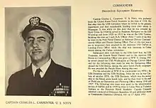 - 1 2 USNA (1926). "Midshipman Charles L. Carpenter biography entry in the United States Naval Academy 1926 Lucky Bag". USNA Lucky Bag. US Navy. Retrieved June 6, 2014. See also: Midshipman Charles L. Carpenter biography entry in Commons.