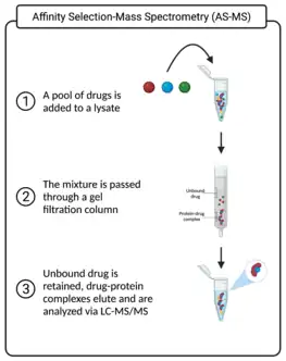 A generalized AS-MS workflow begins with the pre-incubation of purified protein solutions (i.e. target proteins) with chemical libraries in microplates. Assays can be designed to contain sufficiently high protein concentrations to prevent competition for binding sites between structural analogs, ensuring that hits across a range of affinities can be identified; inversely, assays can contain low protein concentrations to allow for distinction between high and low affinity analogs and to inform structure-activity relationships.[20] The choice of a chemical library is less stringent than other high-throughput screening strategies owing to the lack of functional readouts, which would otherwise require deconvolution of the source compound that generates biological activity. Thus, the typical range for AS-MS is 400-3,000 compounds per pool.[20] Other considerations for screening are more practical, such as a need to balance desired compound concentration, which is usually in the micromolar range, with the fact that compound stock solutions are typically stored as 10 millimolar solutions, effectively capping the number of compounds screened in the thousands.[20] After appropriate test compounds and targets are selected and incubated, ligand-protein complexes can be separated by a variety of means.[19]