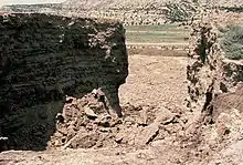 The dam formed the southern wall of one of the mill's three holding ponds, which were used to evaporate tailings solution until the remaining solid waste could be buried.[31] From 1967 to 1982, the mill produced an average of 4,000 short tons (3,600 t) of tailings every day, for a total of 3.5 million short tons (3.2 Mt).[32][7][33][34] The 35-foot (11 m) high embankment was constructed on a deposit of collapsible clayey, silty sand, one hundred feet (30 m) deep.[16] United Nuclear used a new design, recommended by the Nuclear Regulatory Commission, that used earth rather than tailings themselves as building material.[21] The holding pond was not lined, a violation of the Uranium Mill Tailings Radiation Control Act of 1978.[21] This allowed tailings solution to seep into the ground, weakening the foundation of the dam and contaminating the groundwater.[16]