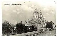 Before the revolution, the building was reconstructed two times. The first one was drafted by architect B. B. Tsinke of the Tobolsk and Siberian eparchy in 1887. The westside was fortified by a massive two-floor parvise with cone porches in neorussian style. The new size crossed the red lines and practically enveloped the church.[6] The other reconstruction was proposed by the mayor of Tyumen and the former merchant of the first guild Andrey Tekutyev, the latter of whom for many years, between 1902 and 1916, was churchwarden.