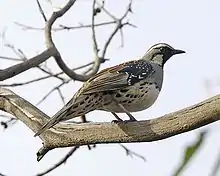 The quail-thrushes and jewel babblers are medium-sized songbirds, 17–28 cm in length.[7][8] They have strong legs and bills. Males and females often differ in plumage markings. The quail-thrushes are largely brown above, the colour varying to provide camouflage against the soil, but are more boldly marked with black and white below.[8] Jewel-babblers usually have extensive blue in their plumage.[7] Most species have loud, distinctive songs.[9]