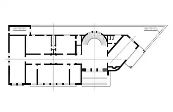 The circulation of the Colegio Nacional de Arquitectos building is through a double-loaded corridor. It was one of the first curtain walls to be used in Cuba.[4] The building consists of a semi-basement and two floors that houses offices, a library, recreation rooms, an auditorium, and a large spiral staircase that forms a large space on three levels which is illuminated by natural light from three panels of glass blocks. It has several outdoor porches. On the outside, coral stone and green Cuban marble are used. The main part of the building (auditorium) is covered by a gable roof, the rest of the building has a flat roof.