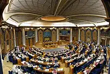The Consultative Assembly of Saudi Arabia (Arabic: مجلس الشورى السعودي, romanized: Maǧlis aš-Šūrā s-Saʿūdiyy), also known as Majlis ash-Shura or Shura Council, is the formal advisory body of Saudi Arabia. It is a deliberative assembly that advises the King on issues that are important to Saudi Arabia. It has the power to propose laws to the King of Saudi Arabia and his cabinet to prove it and pass it. It has 150 members, all appointed by the king and chosen "from amongst scholars, those of knowledge, expertise and specialists".[1] Since 2013, the Assembly has included 30 female members out of the total of 150 members, after a 20 percent minimum quota for women was imposed.[2][3][4] The Consultative Assembly is headed by a Speaker. As of 2016, the Speaker was Abdullah ibn Muhammad Al ash-Sheikh, in line with a tradition that kept the post in that family. The Assembly is based in al-Yamamah Palace, Riyadh.