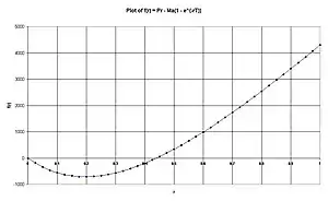 The following table shows calculation of an initial estimate of interest rate followed by a few iterations of the Newton–Raphson algorithm. There is rapid convergence to a solution accurate to several decimal places as may be corroborated against the using the Lambert W or "productlog" function on Wolfram Alpha.