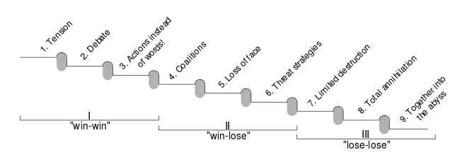 War of extermination Limited war Threat systems (deterrence) Arbitration Mediation Negotiation (exchange) Mutual adaptation Alliance Co-operation Integration[20] Transformation[21]