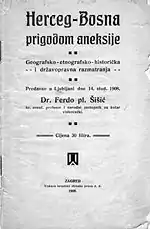 The term Herzeg-Bosnia (Croatian: Herceg-Bosna) appeared in the late 19th century and was used as a synonym for Bosnia and Herzegovina without political connotations. It was often found in folk poems as a more poetic name for Bosnia and Herzegovina. One of the earliest mentions of the term was by Croatian writer Ivan Zovko in his 1899 book Croatianhood in the Tradition and Customs of Herzeg-Bosnia. Croatian historian Ferdo Šišić used the term in his 1908 book Herzeg-Bosnia on the Occasion of Annexation. In the first half of the 20th century the name Herzeg-Bosnia was used by historians such as Hamdija Kreševljaković and Dominik Mandić and Croatian politicians Vladko Maček and Mladen Lorković. Its usage decreased in the second half of the 20th century until 1991 and the proclamation of the Croatian Community of Herzeg-Bosnia.[3] Since the 1990s, it has been used as a name for a Croat territorial unit in Bosnia and Herzegovina.[4]