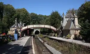 Originally known as Cromford Bridge, it was opened by the Manchester, Buxton, Matlock and Midland Junction Railway in 1849.[3] This is one of the few stations on the line that has been preserved and is a Grade 2 listed building. It is said to have been designed by G. H. Stokes, son-in-law of Joseph Paxton. It is believed that Stokes designed Station House (built in 1855), the extremely ornate former station master's residence opposite the station on the side of the hill as well as the ornate villa style waiting room, on what was the 'up' platform. According to English Heritage,[4] this is the original station building. The present station building on the opposite (down) platform was added by the Midland Railway at a later date