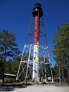 The Crooked River Lighthouse, built in 1895, replaced three lighthouses on Dog Island that over the years were destroyed by storms. The lightstation grounds originally included a house for both the Keeper and the Assistant Keeper, and several outbuildings. At first the lighthouse was painted solid dark red except for the black lantern room. Later (at the end of 1901) the lower half was painted white to offset it from the surrounding pine forest. This is the same daymark seen on the lighthouse today - the lower half white, the upper half red and a black lantern room. After being electrified in 1933, the lighthouse was automated and unmanned in 1952. In 1964 the two houses and all outbuildings were sold and removed from the site. The original 4th Order lens was removed by the Coast Guard in 1976, due to mercury leakage in the float container. The lens was replaced by a modern optic and this beacon remained in operation until the lighthouse was decommissioned in 1995.[4][5]