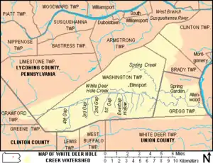 Map of the White Deer Hole Creek watershed, showing Allenwood, Spring Creek, DuBoistown, and Williamsport