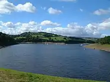 Damflask Reservoir is situated at grid reference SK277907 five miles (eight kilometres) west of the centre of Sheffield in the Loxley valley close to the village of Low Bradfield and within the city's boundaries. The hamlet of Stacey Bank is located to the east.[1] The reservoir has a capacity of 4,250.9 million litres (1,123.1 million gallons) and has a surface area of 47 hectares (120 acres) with a maximum depth of 27 metres (89 feet). The dam wall is approximately 400 metres (1,300 feet) wide with a height of 28 metres (92 feet).