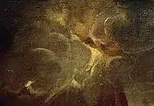 The upper part of the painting was cut away in the late 18th century, apparently because it was damaged. This version is known from copies and a print, and included a face of Jupiter in the cloud, and his attribute of an eagle clutching bolts of lightning.[17] The face in the cloud is not in all versions, and is best seen in the Chicago, Vienna and St. Petersburg versions. This is the first version to include the "attendant crone", the painting of which Nicholas Penny describes as "remarkable and very exciting".[32]