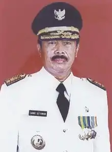 In May 2003, with gubernatorial elections incoming, Setiawan secured the support of Golkar to run. Against him was PDI-P-backed retired major general Tayo Tarmadi, formerly commander of West Java-based Kodam Siliwangi. Despite Tarmadi's military background, however, the 10 of 100 members of the West Java Regional People's Representative Council hailing from the military refused to support him.[2] With implicit military backing, Setiawan was eventually elected as governor of West Java after winning 49 of 88 available votes, the military representatives abstaining in the vote.[2][3] His term began on 13 June 2003.[4] He ran for reelection in the direct elections of 2008, but placed last of three candidates, behind winner Ahmad Heryawan and runner-up Agum Gumelar.[5]