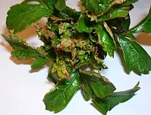 The midge induces stunted and distorted rosettes[4] in the host by inhibiting the elongation of the shoot; the rosette is formed from many (8 to 40 or more) slightly thickened and deformed leaves with reduced petioles. Many of the leaves have small green or red ligulate excrescences or projections. The midge larvae are of an orange-red colour.[1][2]