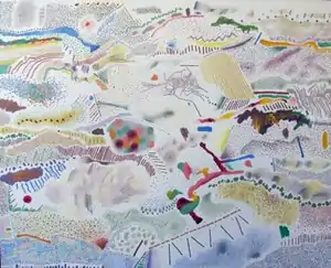Based on drawings representing Sharpe's experience of the midwestern American landscape,[34][1] the paintings appeared primarily abstract except for their compositions—which suggested panoramas of mountains, rivers and geography, surveyed from above—and marks, which seemed to reference architectural and topographical signs and symbols.[10][3][33] Mary Jane Jacob wrote that rather than literal representations, the paintings functioned as composites or "imaginative chartings" of imaginary places.[3] Joanna Frueh described them as a "lyrical fulfillment" of Sharpe's vision that resembled a "vast, integrated organism" expressing union, contentedness, buoyancy and playfulness.[7]