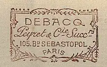 Debacq & Cie was established in Paris in 1812 by Raymond Sabe, who manufactured and traded gold jewellery on 358 rue de la Port St Denis.[2][3] In 1838, he handed the business to his nephews Félix, Victor and Pierre Eugène.[4] Together with Sinice Debacq (the husband of Sabe’s niece) they started a new company "Debacq et Sabe", also known as "Debacq et Sabe neveu" with a store at Royale St Martin 29.[4][5][6]