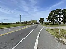 Delaware Route 16 (DE 16) is an east-west state highway in Delaware, mainly across northern Sussex County, with a small portion near the Maryland border in extreme southwestern Kent County. It runs from Maryland Route 16 (MD 16) at the Maryland border in Hickman east to the Delaware Bay at Broadkill Beach. The route passes through rural areas along with the towns of Greenwood, Ellendale, and Milton. DE 16 intersects DE 36 and U.S. Route 13 (US 13) in Greenwood, US 113 in Ellendale, DE 30 and DE 5 in the Milton area, and DE 1 between Milton and Broadkill Beach. West of DE 1, the route serves as part of a connection between the Baltimore–Washington Metropolitan Area and the Delaware Beaches. DE 16 was built as a state highway during the 1920s and 1930s. By 1936, the route was designated onto its current alignment.