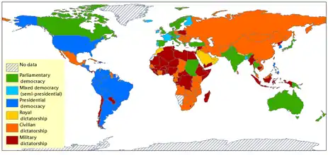 A presidential democracy has a government that does not need the majority support of a legislature to stay in power. A semi-presidential (mixed) democracy has a government that needs the majority of support from a legislature to exist and whose head of state is popularly elected for a fixed term. Parliamentary democracy is the same as semi-presidential but has heads of state which are not popularly elected for a fixed term, typically either monarchs or officials not chosen by popular elections. [8]:457