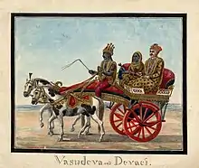 During the nuptials of Vasudeva and Devaki following the former's wedding with his bride's six older sisters, Vishnu picked a lock of hair from his mount Shesha as well as his own, proclaiming that they would take be born as Devaki's seventh and eighth children, respectively.[9] After the marriage ceremony, Kamsa volunteered to escort the newly-weds to Mathura and drove their chariot. A celestial voice, an aśarīrī, prophesied that the eighth child of Devaki would become Kamsa's death, and deliver the land from his wickedness. Angered, Kamsa rose to kill Devaki, but was stopped by Vasudeva, who promised to give each child to Kamsa, whom he would subsequently kill.[10][11][12]