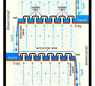 Section of an industrial distillation tower showing detail of trays with bubble caps
