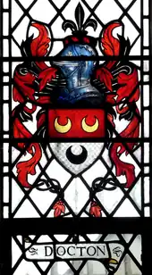 The arms of the Docton family were: Per fess gules and argent, two crescents in chief or another in base sable.[6] These may be seen, amongst other places, in a 1933 stained glass window in St Nectan's Church, Hartland, by Townshend and Howson and on the ledger stone to Phillipa Cary (1603–1633) in Clovelly Church.