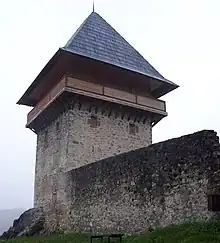 In 1407, Sigmund led the Hungarian army and attacked Donji Kraji, but was stopped. The turning point came after the Sigmund victory in the Battle of Dobor (1408). Hrvoje did not personally participate in the battle, but the disaster of the Bosnian forces led him to reconcile with the Hungarian king. In doing so, he lost all the privileges he received from Ladislaus and his power declined.[46] Hrvoje turned to the Ottomans and brought them to Bosnia resulting in the Battle of Doboj (1415) where Hungarians were defeated. He died at the beginning of 1416 after which his possessions disintegrated rapidly, and while parts remained within the family other were integrated into royal demesne. His widow Jelena later married the Bosnian king Ostoja. A major fortified castle of Jajce, which was built in the 14th century and initially was seat of Hrvoje Vukčić, now became one of the capital cities of the Kingdom of Bosnia[47] as Jajce too, in the aftermath of Hrvoje's death, has passed back to the royal domain. It was royal domain located in Donji Kraji, as Stephen Thomas refers to it as "royal seat",[48] and its citadel has a portal decorated by his Kotromanić royal coat of arms.[48]