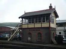 Built in 1892 and located at the station throat between the carriage shed and the workshops. The Points Box, as it was called locally, contained a 36-lever frame signal box was built by Dutton & Co., of Worcester, and supplied to the railway when the yard was further modified and the workshops were extended. The frame is a unique survivor of the 'drink-handle' type in which the handle of the lever also serves as the catch handle. The 'box features a set of characteristic wooden external steps that must be climbed to access the levers, with storage space beneath the timber-built top section, this would have housed all the linkage and control gear. The top section also features a three-quarter glazed section and integral fireplace, and bears a considerable resemblance to Dutton's signal boxes constructed for the Great Northern Railway (Ireland) about this time. From there the signalman on duty could command a view of the entire yard, controlling every traffic movement from passenger trains to complex shunting procedures. The one thing the signalman did not control was the staff and ticket single line safe-working, which in accordance with earlier practice remained the responsibility of the stationmaster. Douglas signal box lacked both telegraph and telephone when it was constructed, and it was not provided with a telephone until 1925 following an overrun accident in August of that year. Train to and from Peel and Castletown, and for shunting movements within the station were indicated to the signalman by a comprehensive whistle code.