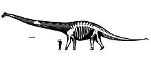 Estimates based on measurements of the known parts of the skeleton suggest that the only known individual of Dreadnoughtus schrani was approximately 26 metres (85 ft) long and stood about 2 stories tall.[4] At 1.74 m, its scapula is longer than any other known titanosaur shoulder blade.[4] Its ilium, the top bone of the pelvis, is also larger than any other, measuring 1.31 m in length.[4] The forearm is longer than any previously known from a titanosaur, and it is only shorter than the long forearms of brachiosaurids, which had a more inclined body posture.[4] Only Paralititan[19] preserves a longer humerus (upper arm bone). Although each species likely had slightly different body proportions, these measurements demonstrate the massive nature of Dreadnoughtus schrani.[4] The estimated mass of the type specimen is about 48–49 metric tons (53–54 short tons).[12][18]