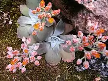 11. 1 2 Yost, Jenn M.; Bontrager, Megan; McCabe, Stephen Ward; Burton, Darren; Simpson, Michael G.; Kay, Kathleen M.; Ritter, Matt (2013-12-01). "Phylogenetic Relationships and Evolution in Dudleya (Crassulaceae)". Systematic Botany. 38 (4): 1096–1104. doi:10.1600/036364413X674760. S2CID 15715233. Dudleya cymosa is a highly variable taxon that occurs throughout the foothills of California, and has been treated as nine different subspecies (McCabe 2012). Many of the relationships among subspecies remain unresolved with D. c. subsp. agourensis K. M. Nakai, D. c. subsp. ovatifolia (Britton) Moran, D. c. subsp. crebrifolia K. M. Nakai & Verity, D. c. subsp. pumila (Rose) K. M. Nakai, and D. c. subsp. marcescens Moran stemming from a large polytomy at the base of the tree. However, two of the D. cymosa subspecies, D. c. subsp. cymosa and D. c. subsp. paniculata, occur in the Virens clade as sister to D. abramsii subsp. setchellii, a federally listed endangered species from Santa Clara County, California.