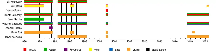 Initially known as Kolektiv, the group began performing in 1986. The lineup included vocalists Bittová and Jiří Kolšovský, guitarists Josef Ostřanský and Pavel Richter, bassist Vladimír Václavek, and drummer Fajt. The group, all members of which were active in other projects, performed only sporadically at the time.[2]