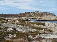 The first of several lighthouses was built at Chebucto Head in 1872 with a steam foghorn just below it. The lighthouse was moved in 1940 several hundred metres to the north to make way for the gun battery.[3] The lighthouse included a launch ramp for a lifeboat, as well as an old naval carronade for firing blank charges as a crude foghorn. Some ruins of the original lighthouse can be seen to this day (2008)