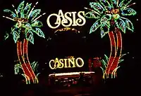 The Oasis Casino featured curved neon palm trees at its entrance, standing 70 feet with fronds 20 feet in length. They were designed by Ad-Art sign designer Jack DuBois, based on early design work by Raul Rodriguez.[209][210] The palms were dismantled in April 1993, after being sold during the liquidation sale to a buyer in Taiwan.[211] By 1999, the palms had been installed at the entrance to the NASA nightclub in Bangkok. The club closed some time after that, and the whereabouts of the palms are unknown.[209][210]