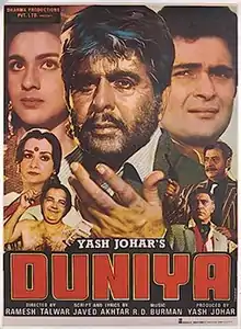 Duniya (transl. The World) is a Hit 1984 Hindi-language action film directed by Ramesh Talwar, starring Ashok Kumar, Dilip Kumar, Rishi Kapoor, Amrita Singh in lead roles. The music was composed by R. D. Burman.