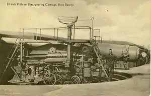 A US coast defense battery with two guns on disappearing carriages, similar to the 10-inch gun battery at Fort Greble