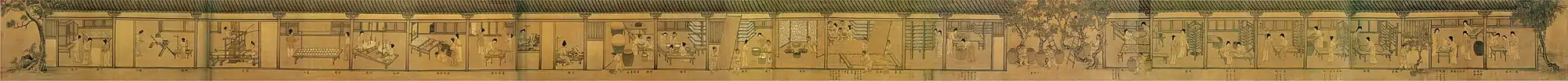 Rural families that sold a large agricultural surplus to the market not only could afford to buy more charcoal, tea, oil, and wine, but they could also amass enough funds to establish secondary means of production for generating more wealth.[24] Besides necessary agricultural foodstuffs, farming families could often produce wine, charcoal, paper, textiles, and other goods they sold through brokers.[24] Farmers in Suzhou often specialized in raising bombyx mori to produce silk wares, while in Fujian, Sichuan, and Guangdong farmers often grew sugarcane.[24] In order to ensure the prosperity of rural areas, technical applications for public works projects and improved agricultural techniques were essential. The vast irrigation system of China had to be furnished with multitudes of wheelwrights mass-producing standardized waterwheels and square-pallet chain pumps that could lift water from lower planes to higher irrigation planes.[25]