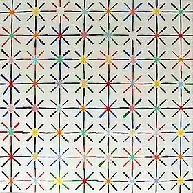 Sometimes the "Ehrenstein" is associated with an illusory contour figure where the ends of the dark segments produce the illusion of circles or squares.[1][2][3] The apparent circular figures at the centre of the configuration are the same colour as the background, but appear brighter. The brightness effect disappears when the line segments are joint with a circular disk. This fits under the characteristics of an optical illusion, as there are no physical origins to the asymmetrical perceptual sensations we perceive.[1]