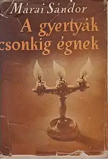 Embers is a 1942 novel by the Hungarian writer Sándor Márai. Its original Hungarian title is A gyertyák csonkig égnek, which means "Candles burn until the end". The narrative revolves around an elderly general who invites an old friend from military school for dinner; the friend had disappeared mysteriously for 41 years, and the dinner begins to resemble a trial where the friend is prosecuted for his character traits. The book was published in English in 2001.[1]