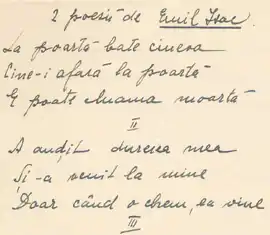 Emil Isac's work was published in several new editions during the decades after his death. Such volumes enlisted contributions from several authors and critics of the day: Ion Brad, Veronica Porumbacu, György Rába, Elemér Jancsó, Mircea Zaciu, Mircea Tomuş, Ion Oarcăsu, Leon Baconsky, Dumitru Micu, Constantin Ciopraga etc.[5] His contributions were gathered into a definitive Hungarian-language translation, printed in Bucharest in 1962, while his correspondence with Hungarian intellectuals was issued as Hungarian-language magazines and separate volumes, in both Romania and Hungary.[35] His various poems were included into several anthologies of Romanian poetry, or published individually, in Argentina, Belgium, Brazil, France, Greece, Hungary, Italy, the Soviet Union (Russian SFSR, Armenian SSR), and the United Kingdom.[21]