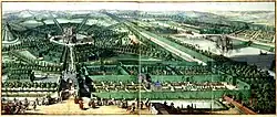 Thanks to engravings made by Romeyn de Hooghe around 1680, we can have a view how the gardens were at that time.[2] There were fountains, pavilions, triumphal arches, statues, mountains, an orangery, a theatre, artificial caves and other follies. In the centre of the gardens a seven-sides pavilion was constructed, which served both as a temple of Hercules and an observatory. The viewing terrace was reached by a movable windlass staircase. The basin around the pavilion contained water that, according to the principle of communicating vessels, provided the necessary water pressure for the fountains and other hydraulic elements in the park. Seven large and seven small allees departed from the pavilion, each with its own tree species and landscape. The small avenues always led to a "bulwark" where a god statue stood. The whole was imbued with cosmological significance.