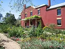Most plant varieties chosen have been known to exist in Australian gardens prior to 1850. The lack of grassed areas reflects the fact that "cottage beds" were easier to maintain than lawns. Areas are connected with gravel, stone or brick paths. An eccentric orchard under-planted with white evening primrose, alyssum and bulbs forms a second section. The orchard is bisected by a winding gravel path where azaleas grow. The left side of the orchard provides more circular forms and incorporates a stone folly to mark the ruin of a former stable and loft known to have existed at this position. The statue is placed at the intersection of various axes including those from the stair light window and back door. A third section is a drying court and kitchen garden (currently a herb garden and strawberry patch), which leads through the hedge to a formal parterre cottage garden with sundial centrepiece. The hedge is African olive (Olea europaea var.africana), a common form of colonial hedging. The seedlings were collected from surrounding paddocks and planted in 1989. The hedged parterre is being converted from self-seeding annuals to a rose garden of older European varieties (15th to 19th centuries), grown on their own roots (where available) and under-planted with hardy perennials.[2][1]