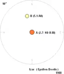 Epsilon Boötis consists of a pair of stars with an angular separation of 2.852 ± 0.014 arcseconds at a position angle of 342.°9 ± 0.°3.[24] The brighter component (A) has an apparent visual magnitude of 2.37,[2] making it readily visible to the naked eye at night. The fainter component (B) is at magnitude 5.12,[3] which by itself would also be visible to the naked eye. Parallax measurements from the Hipparcos astrometry satellite[25][26] put the system at a distance of about 203 light-years (62 parsecs) from the Earth.[1] This means the pair has a projected separation of 185 Astronomical Units, and they orbit each other with a period of at least 1,000 years.[19]