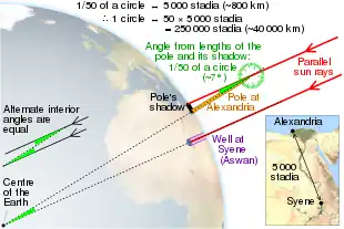 The simplified method works by considering two cities along the same meridian and measuring both the distance between them and the difference in angles of the shadows cast by the sun on a vertical rod (a gnomon) in each city at noon on the summer solstice. The two cities used were Alexandria and Syene (modern Aswan), and the distance between the cities was measured by professional bematists.[16] A geometric calculation reveals that the circumference of the Earth is the distance between the two cities divided by the difference in shadow angles expressed as a fraction of one turn.