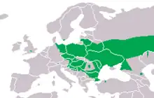 The European fire-bellied toad is found throughout Central and Eastern Europe.[3] More particularly, its range starts in eastern Germany (including eastern Denmark and parts of southern Sweden), and then east to the Volga District of Russia where they are stopped by the Ural Mountains.[4] The frog's most southern range is Bulgaria and the Marmara Region of Turkey.[6][7][8]