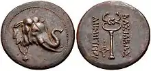 - โ No undisputed coins of Demetrius I himself use this title, but it is employed on one of the pedigree coins issued by Agathocles, which bear on the reverse the classical profile of Demetrius crowned by the elephant scalp, with the legend DEMETRIOU ANIKETOU, and on the reverse Herakles crowning himself, with the legend "Of king Agathocles" (Boppearachchi, Pl 8). Coins of the supposed Demetrius III also use the title "Invincible", and therefore are attributed by some to the same Demetrius (Whitehead and al.)